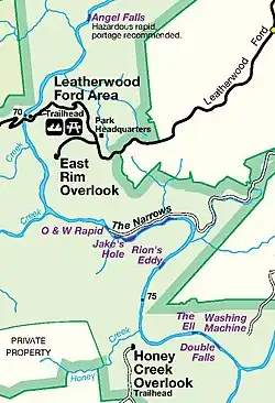 Excerpt from an NPS map, showing the confluence (bottom right), rapids up to Leatherwood Ford, and Angel Falls downstream (northward)[g]