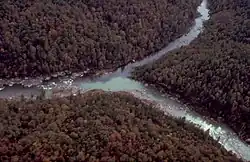 8. ^ Distance and difficulty per put in is as follows: Zenith Mine to Leatherwood Ford Bridge, 8.5 miles (13.7 km), class II; Burnt Mill Bridge to Leatherwood Ford, 11.5 miles (18.5 km), class III-IV; New River Bridge to Leatherwood Ford, 15.5 miles (24.9 km), class I-IV[17]