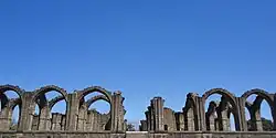 The citadel, built by Yusuf Adil Shah, a mile (2 km) in circuit, is of great strength, well built of the most massive materials, and encompassed by a ditch 100 yards wide, formerly supplied with water, but now nearly filled up with rubbish, so that its original depth cannot be discovered. Within the citadel are the remains of both Hindu temples and old mosques, which prove that Bijapur was an important town. The fort, which was completed by Au Adil Shah in 1566, is surrounded by a wall 6 m. in circumference. This wall is from 30 to 50 ft (10 to 15 m) high, and is strengthened with 96 massive bastions of various designs. In addition there are ten others at the various gateways. The width is about 25 ft (8 m); from bastion to bastion runs a battlemented curtained wall about 10 ft (3 m) high. The whole is surrounded by a deep moat 30 to 40 ft (10 to 12 m) broad. Inside these walls the Bijapur kings bade deference to all comers. Outside the walls are the remains of a vast city, now for the most part in ruins, but the innumerable tombs, mosques, caravanserais and other edifices, which have resisted the havoc of time, afford abundant evidence of the ancient splendour of the place.