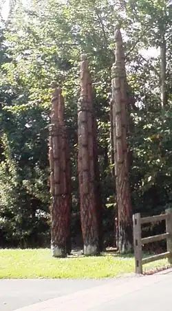 At the Bilston end of the Black Country Route can be seen the group of wooden statues designed by Robert Koenig and called "Steel Columns." "This sculpture was made from 15 lengths of sweet chestnut which stretch up to 6 metres in height. The male and female figures depicted are based on those found in old Victorian photographs of Bilston. The title Steel Columns is a reference to Bilston's steel making background and the connection the figures had with this history."[36]
