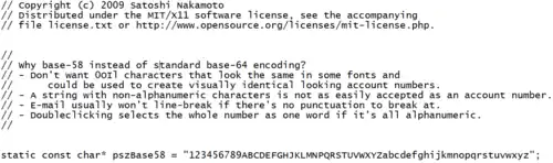 Base58 Integer ~73% C, C++, Python, C#, Java Similar to Base64, but modified to avoid both non-alphanumeric characters (+ and /) and letters that might look ambiguous when printed (0 – zero, I – capital i, O – capital o and l – lower-case L). Base58 is used to represent bitcoin addresses. Some messaging and social media systems break lines on non-alphanumeric strings. This is avoided by not using URI reserved characters such as +. For SegWit, it was replaced by Bech32, see below.