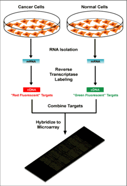 cDNA microarrays are often used for large-scale screening and expression studies.[33] In cDNA microarrays, mRNA from cells are collected and converted into cDNA by reverse transcription.[3] Subsequently, cDNA molecules (each corresponding to one gene) are immobilized as ~100 μm diameter spots on a membrane, glass, or silicon chip by metallic pins.[3][33] For detection, fluorescently-labelled single strand cDNA from cells hybridize to the molecules on the microarray and a differential comparison between a treated sample (labelled red, for example) and an untreated sample (labelled in another color such as green) is used for analysis.[3] Red dots mean that the corresponding gene was expressed at a higher level in the treated sample. Conversely, green dots mean that the corresponding gene was expressed at a higher level in the untreated sample. Yellow dots, as a result of the overlap between red and green dots, mean that the corresponding gene was expressed at relatively the same level in both samples, whereas dark spots indicate no or negligible expression in either sample.