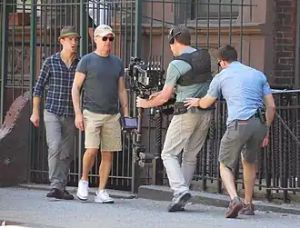 Lubezki was concerned that no film had been shot in the way Iñárritu envisioned, meaning there would be no reference material to look up. The two decided the only way to learn how to shoot it would be to shoot it themselves, so they built a proxy stage at Sony Studios in Los Angeles.[28][31] The setup was minimal. Canvas and C-stands were used for walls, while tape and a few pieces of furniture marked out areas.[28][32] Using a camera and some stand-ins, the duo worked through the movie to see if it was possible.[28] Realizing no theatre could accommodate the intricate camerawork they needed, they hired Kaufman Astoria Studios in New York.[33] Still, Iñárritu wanted to shoot at a Broadway theater, but would have to wait until several weeks into rehearsals before securing St. James Theatre.[34] They then spent a few months designing and making "blueprints" of the shots and blocking the scenes, using the stand-ins to read and walk through the script.[29] The planning was precise. Iñárritu said: "There was no room to improvise at all. Every movement, every line, every door opening, absolutely everything was rehearsed."[31] The actors started rehearsing once this preliminary work was completed: According to Lubezki, they did the scenes with the actors "once we kind of knew what the rhythm of the scenes were". He described the atypical approach "like an upside down movie where you do post-production before the production".[28]