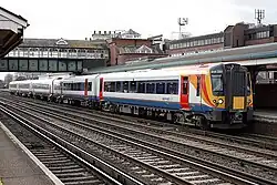 Eastleigh railway station serves the town of Eastleigh, in Hampshire, England. It is a stop on the South West Main Line and is the junction station for two other routes: the Eastleigh-Fareham Line and the Eastleigh-Romsey Line. It lies 73 miles 35 chains (118.2 km) from London Waterloo. South of the station are Eastleigh Railway Works and Eastleigh Depot.