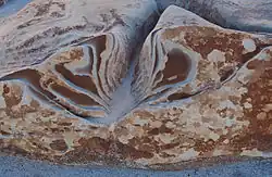 In the late Cretaceous, North America was divided by the Western Interior Seaway, whose western shoreline moved back and forth across what are now the mountain states of the United States.[7] About 74 million years ago, the sea made its final retreat from the Bisti/De-Na-Zin area to the northeast, depositing the Fruitland Formation on top of the shoreline sandstone of the Pictured Cliffs Formation (which is exposed south of the Bisti/De-Na-Zin Wilderness.)[8] The Fruitland Formation records flood plains and delta environments behind the receding shoreline, including swamps in which economical deposits of coal were formed. These are mostly found in the Ne-Nah-ne-zad Member of the Kirtland Formation. As the shoreline continued to recede, the Fossil Forest Member was deposited, which has much less coal but is rich in fossils.[9] At the Bisti/De-Na-Zin Wilderness, the Fruitland Formation consists mostly of gray shales, with thin coal beds and with resistant beds of white sandstones deposited in river channels. The formation also contains brown to purple iron concretions. In some places, the coal caught fire and burned to produce a red, hard rock, called clinker or red dog.[7]