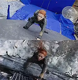 The film's visual effects vendors included Cinesite, Digital Domain, Industrial Light & Magic, Mammal Studios, SSVFX, Scanline VFX, Trixter, and Wētā FX.[157] Digital Domain was responsible for the final battle sequence and completed around 320 visual effects shots for the film. They created the Red Room, an airborne fortress hidden in the clouds, which was inspired by the brutalist architecture of the Soviet Union.[158][159] A combination of practical and visual effects were used to create the sequence where the Red Room is destroyed and falls from the sky: actors and stunt performers were filmed in a wind tunnel against bluescreens while being held with wires and mechanical arms, and the surrounding environment of sky and debris was created digitally.[158][159] Cinesite primarily handled the Russian prison that Harbour's Alexei Shostakov / Red Guardian is found in.[160] Wētā FX created the mountain range that surrounds the prison, based on photography from Svalbard, Norway, as well as an avalanche. Wētā also created the Mil Mi-8 helicopter that is seen in that sequence,[161] while Cinesite created it for other sequences.[160] For the pigs on the farm of Weisz's Melina Vostokoff, Wētā filmed live Kunekune pigs as reference for the digital pigs in the final shots.[161]