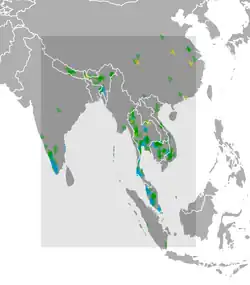 In southern India the species is regularly reported in winter[13][14] mainly from the Western Ghats (breeding records have been questioned[4]), Eastern Ghats (mainly on spring passage) and known to breed in northeastern India and Burma.[15][16] Winter records of the species include stray occurrences in or near metropolitan areas such as the Guindy National Park in Chennai,[17][18] near Trivandrum[19][20] and Bangalore.[21] More recent studies have suggested that the species may be a regular winter visitor in the eastern part of peninsular India, and not just a passage migrant.[22] Individuals have also been noted at Point Calimere.[23]
