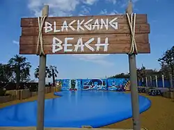 According to a May 2000 talk to the Isle of Wight Postcard Club by the then director, Mr Simon Dabell, the etymology is simply "black pathway" (the original appearance of the chine),[4] but the theme park understandably fosters the interpretation of a smuggling origin. Thus visitors to the park are greeted by a gigantic fibreglass statue of a smuggler between whose legs they could pass to enter.[5]