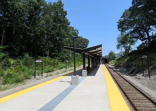 Final design of the station, including analyzing 26 nearby homes for noise abatement, was expected to be completed in the middle of 2012. However, local elected officials demanded an independent design review of the project, further delaying the project to at least 2015.[9] The MBTA had planned to advertise the $10 million construction contract in December 2012, but did not do so.[12] In July 2013, the MBTA announced that construction would begin within several months, but again this was a false start.[13] A public meeting held in April 2014 showed mixed local opinions about the stations, with some nearby residents feeling that the stop was imposed on the neighborhood by the MBTA without sufficient public input.[14] At that meeting, the MBTA presented a plan under which construction would begin in May 2015 for a December 2016 opening.[15] A later meeting in September 2014 adjusted the schedule, with construction beginning in September 2015 for a June 2017 opening.[2]