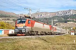 The arrangement is extensively used on Italian and Japanese railways.[2] Other examples include New Zealand's DJ, EW and EF classes; the Eurotunnel Class 9 locomotives, which were themselves derived from the New Zealand EF class; the Swiss SBB Re 6/6 (Re 620);[3] the Russia Railways VL65, EP1 (EP1M), EP10 and EP20; and the South Korean Korail Class 8000. China imported 6K electric locomotive from Japan between 1986 and 1987. The Bo-Bo-Bo design was applied to SS7 series except SS7E. Locomotives of this type are also used on Myanmar railways.[4][5]