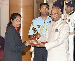 After applying for the Dhyan Chand Award multiple times and losing the chance to receive it, Bobby was finally awarded with it in 2018.[12] She was presented the award on 25 September by the President of India Ram Nath Kovind at Rashtrapati Bhawan.[13] In one of her interviews, she said "I'm lucky to win it this time. I've been applying for this honour ever since Dhyan Chand Award was instituted in 2002.The honour will motivate me to take coaching seriously. After Nayana James left me after just one year of training under me, I stopped coaching. Now, I am planning to make a comeback to serious coaching."[14]