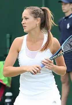 Her next tournament was the French Open, where she defeated María Irigoyen in the first round of the qualifying stage, but then fell to Anastasia Pivovarova in the second. She then suffered losses in the semifinal of the ITF event in Maribor and the Eastbourne International qualifications, but managed to enter into the main draw at Wimbledon.[18] Jovanovski defeated Casey Dellacqua in the first round, but lost to eighth seed Victoria Azarenka in the second. Her result at Wimbledon helped her ranking rise to world No. 93. Jovanovski then played at the Slovenia Open but lost to compatriot and world No. 2, Jelena Janković, in the opening round. At the İstanbul Cup, she won three matches in straight sets to qualify for the main draw, but lost to Elena Vesnina in the first round. In August, Jovanovski qualified for the main draw of the first Premier 5 of the US Open Series, the Cincinnati Open.[19] She upset the 14th seed Aravane Rezaï in the first round,[20] but lost to Akgul Amanmuradova in the following round in straight sets. Jovanovski then attempted to qualify for the Rogers Cup and the Connecticut Open, but fell to Sorana Cîrstea and Elena Vesnina, respectively. Jovanovski played her second major event at the US Open, but was defeated by Anastasia Rodionova in the first round. She also competed in women's doubles partnering with Janković, but they were defeated by Kimiko Date-Krumm and Ayumi Morita.