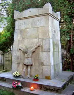 Prus's tomb was designed by his nephew, the noted sculptor Stanisław Jackowski. On three sides it bears, respectively, the novelist's name, Aleksander Głowacki, his years of birth and death, and his pen name, Bolesław Prus. The epitaph on the fourth side, “Serce Serc” ("Heart of Hearts"), was deliberately borrowed from the Latin “Cor Cordium” on the grave of the English Romantic poet Percy Bysshe Shelley in Rome's Protestant Cemetery.[68][69] Below the epitaph stands the figure of a little girl embracing the tomb – a figure emblematic of Prus's well-known empathy and affection for children.[70][71]