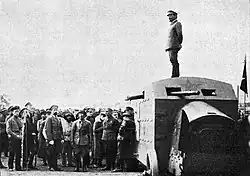 The Insurgents had themselves claimed that their anti-Bolshevik uprising constituted a "Third Revolution", drawing a direct line of succession from the February Revolution and October Revolution, intending to rally together all revolutionary socialists that still supported "free soviets".[80] This drew the attention of Wrangel, who had just defeated Dmitry Zhloba's 30,000-strong Cavalry Corps in Northern Taurida.[90] Wrangel himself had already reorganized the White movement, making concessions to the local Crimean peasantry and attempting to reach out to other anti-Bolshevik forces.[91] On 9 July, one of Wrangel's emissaries met with the Insurgent staff at Vremivka,[92] where he proposed that the Insurgents cooperate with the Whites in their war against the Bolsheviks.[93] Outraged by the proposal, the Insurgents immediately shot the messenger[94] and when a second envoy was sent, they lynched him and hung a sign on his corpse that read "all White emissaries will share this one's fate."[95] Despite the insurgent staff having officially rebuffed Wrangel's overtures, Red, White and foreign newspapers continued to circulate rumours of the alleged alliance,[96] even convincing two former insurgent lieutenants to join the Russian Army as a partisan detachment baring Makhno's name.[97] The Makhnovists responded by issuing a categorically anti-Wrangel declaration, in which they reiterated their history of fighting against counterrevolutionaries and appealed to White soldiers to defect to the insurgent banner.[98]
