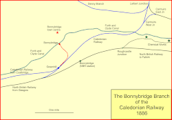 The Scottish Central Railway (SCR) opened its main line in 1848, connecting at junctions at Greenhill with the Edinburgh and Glasgow Railway (E&GR) and the Caledonian Railway. In the vicinity of Bonnybridge, the SCR route passed between the E&GR main line and the canal. A station was provided at Greenhill Junction,[note 1] but despite its location less than a mile away this was not convenient for Bonnybridge, being positioned on a road which had no bridge over the canal.[5]