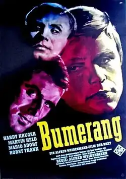 Boomerang (German: Bumerang) is a 1960 West German crime thriller film directed by Alfred Weidenmann and starring Hardy Krüger, Martin Held and Mario Adorf.[1] [2] It was shot at the Tempelhof Studios in West Berlin and on location around the city. The film's sets were designed by the art directors Wolf Englert and Ernst Richter.
