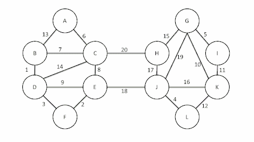 {A,B,C,D,E,F,G} | In the second and final iteration, the minimum weight edge out of each of the two remaining components is added. These happen to be the same edge. One component remains and we are done. The edge BD is not considered because both endpoints are in the same component. |