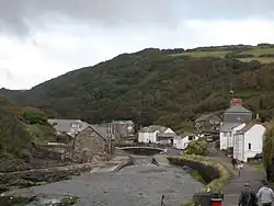 Boscastle (Cornish: Kastelboterel)[1] is a village and fishing port on the north coast of Cornwall, England, in the civil parish of Forrabury and Minster (where the 2011 Census population was included) . It is 14 miles (23 km) south of Bude and 5 miles (8 km) northeast of Tintagel.[2] The harbour is a natural inlet protected by two stone harbour walls built in 1584 by Sir Richard Grenville and is the only significant harbour for 20 miles (32 km) along the coast. The village extends up the valleys of the River Valency and River Jordan. Heavy rainfall on 16 August 2004 caused extensive damage to the village.