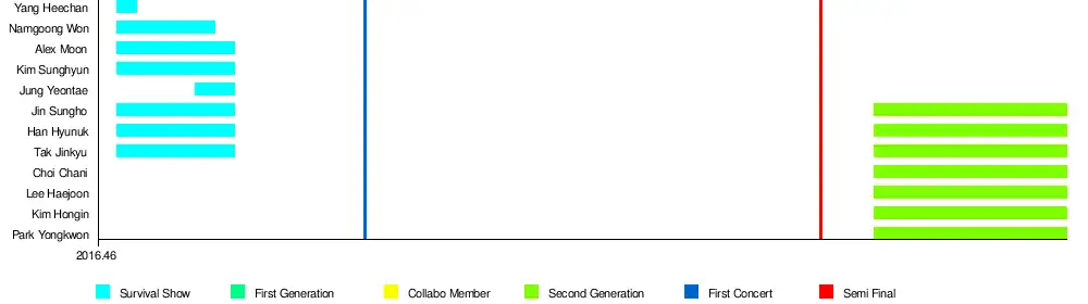 The survival show with the same name as the group was a 2016 reality boy group unit survival show that aired every Saturday 10pm on Mnet and tvN. It was a large-scale project in which the units of a selected number of members would be produced from a pool of 49 free-agents.[44]