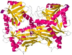 In bacteria, there is only one isoform of the BCAT enzyme. However, the structure of the enzyme is different between organisms. In Escherichia coli, the enzyme is a hexamer containing six identical subunits. Each subunit has a molecular weight of 34 kDa and is composed of 308 amino acids.[25] In contrast, Lactococcus lactis BCAT is a homodimer similar to the mammalian isoforms. Each subunit of the L. lactis BCAT is composed of 340 amino acids for a molecular weight of 38 kDa.[26]