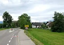 St. Radegund's Church, a Gothic structure, was first mentioned in 1468 as a church belonging to the Diocese of Radovljica, but is an older building with Romanesque foundations, partly reflected in the shape of nave and its flat ceiling. Most of the remaining structure is from the mid-17th century. There are two entrances to the church, one from the 14th century and a dated Renaissance portal from 1629. The bell tower with its typical onion-shaped roof is Baroque. There are frescoes of St. Radegund and St. Lawrence on the southern wall. St. Michael fighting a dragon is depicted on the northern wall and there is a baroque painting of St. Christopher on the southern exterior. There is evidence of a wall encircling the church, probably built in the 15th century to protect local inhabitants against Turkish raids in the area.[4] This was demolished in the 17th century, when the church was being rebuilt.