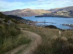 Originally called Bridle Road, the Bridle Path is a legal road between Lyttelton and Ferrymead.[4][5] It was originally constructed as a way for the first Canterbury Association settlers to traverse the Port Hills that surround Lyttelton and take horses, cattle and sheep from the port to the land they would settle on the Canterbury Plains.[4][1] The path was too steep to ride horses all the way, so riders had to dismount and lead their horses by the bridle over the steepest parts, hence the name.[4] The lower sections of the historic pathway have become sealed roads bearing the name Bridle Path Road in both Lyttelton and the Heathcote Valley. The steeper part between the ends of the road remains a walking track to this day.[6]