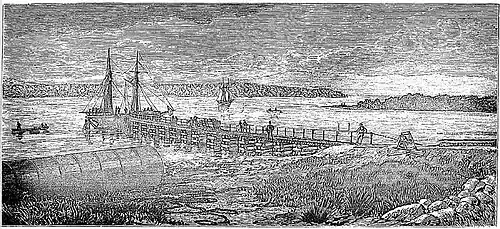 The British and Tasmanian Charcoal Iron Company constructed a second longer timber wharf at the end of Redbill Point. This newer wharf was 600 feet long and, because it extended into deeper water, allowed ships to be docked at all times.