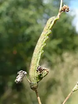 The larva is brown or green with darker diamonds along the back. It feeds on the flowers and buds of various yellow-flowered Asteraceae such as hawksbeards, hawkweeds and sow thistles.[2] The species overwinters as a pupa.