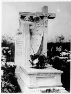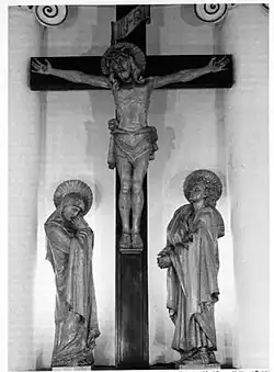 - A "Jubilee Cross" for the Church of the Holy Trinity in Bydgoszcz (1934). It is currently located on the northern wall of the nave of the church. The monumental cross is approx. 430 centimetres (14.1 ft) high, with life-size figures, made of polychrome wood. The work was founded by the "Brotherhood of the Living Rosary of Mothers" (Polish: Bractwo Żywego Różańca Matek) and consecrated on 18 November 1934.