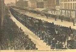 Shook and Palmer were already enjoying success with their Union Square Theatre Company in New York and went on to transplant a number of their productions to the Brooklyn house.[12] Their specialty was the adaptation of French plays to the American stage.[13] The Two Orphans was a melodrama about two young homeless orphans separated by abduction; it featured Miss Kate Claxton[14] and was presented on the night of the fire.[15] It had been a particularly successful play, running for 180 performances in 1874 at the Union Square Theatre.[16] It was originally Les Deux Orphelines by Adolphe d'Ennery and Eugène Cormon,[13] and had been adapted to the American stage by N. Hart Jackson.[13][17] Shook and Palmer brought it to the Brooklyn Theatre in March 1876 after an American tour, including one performance at the Brooklyn Theatre on April 12, 1875, two weeks before Sara Conway's death.[18]