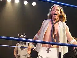 After not appearing at Chikara's shows in March 2011, despite being advertised, Lince Dorado's profile was quietly removed from the promotion's official website, confirming his departure from the promotion. On March 13 Claudio Castagnoli and Eddie Kingston finally faced each other in a grudge match fifteen months in the making, with Castagnoli emerging victorious after hitting Kingston with a chain. At the same event Jakob Hammermeier made his in–ring debut, defeating Green Ant, following interference from the rest of BDK.[46][47] When Ares, Castagnoli and Tursas decided not to enter the 2011 King of Trios, Tim Donst was placed in charge of leading BDK in the tournament. After weeks of scouting, Donst, voicing his displeasure with the rest of BDK, announced Delirious and Jakob Hammermeier as his partners and, on April 15, led the BDK trio to defeat Da Soul Touchaz (Acid Jaz, Marshe Rockett and Willie Richardson) in the first round of the tournament.[48][49] The following day, the BDK trio was eliminated from the tournament in the quarterfinal stage by The Colony (Fire Ant, Green Ant and Soldier Ant).[50] In early 2011 Tursas was given a more prominent role in BDK as he began writing anti-American blog entries on Chikara's official website, drawing the ire of Green Ant, which led to the two entering a feud, which closely followed a feud between Lex Luger and Yokozuna from 1993 with Green Ant taking over Luger's role as the patriotic American and Tursas working as the foreign giant.[50][51][52][53] After months of buildup, the two faced each other on July 30 in a match, where Tursas was victorious, following outside interference from Jakob Hammermeier.[54] In May, both Claudio Castagnoli and Sara Del Rey were entered into the 12 Large: Summit to determine the first ever Chikara Grand Champion. On July 31 the two faced each other in a tournament match in the main event of the second night of the Chikarasaurus Rex weekend. After Del Rey managed to score an upset win over her BDK leader, Castagnoli turned on, not only her, but also Daizee Haze, as she was standing up for her regular tag team partner.[54] On August 3, Del Rey officially announced her resignation from BDK.[55] Three days later, Chikara announced that Daizee Haze would be taking a leave of absence from the promotion after suffering a storyline injury at the hands of Castagnoli.[56] At the following event on August 27, Castagnoli was defeated by Icarus and thus eliminated from contention in the 12 Large: Summit.[25] This would mark Castagnoli's final appearance for Chikara as the following month he signed a developmental contract with WWE.[57] After losing to UltraMantis Black that same day, Pinkie Sanchez also left Chikara and BDK.[25] On November 13 at Chikara's first internet pay-per-view, High Noon, Ares put the Eye of Tyr and Donst his hair on the line against UltraMantis Black's and Hallowicked's masks in a No Disqualification match. UltraMantis ended up regaining the Eye of Tyr by pinning Ares for the win, after Donst abandoned his stablemate in order to save his hair.[58] Following the event, all members of BDK, with the exception of Jakob Hammermeier and Tim Donst, were removed from Chikara's official roster page.[59] In July 2012, Hammermeier and Donst began having problems with each other, highlighted by Donst costing Hammermeier his Young Lions Cup X semifinal match against A. C. H. on August 17.[60][61] Despite the problems, Hammermeier was looking forward to continuing to team with Donst en route to a possible match for the Campeonatos de Parejas,[62] however, on October 7, Donst turned on Hammermeier after a tag team match,[63] and afterwards lashed out on him, declaring himself a singles wrestler looking for a shot at Eddie Kingston's Grand Championship instead.[64]