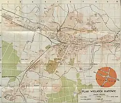 In October of the same year, the Upper Silesia region was annexed into the Third Reich,[69] and the new occupying authorities restored the pre-1922 place names, leaving all administrative changes that had occurred up until then unchanged.[62] On 3 February 1942, by decree of the Oberpräsident of the Province of Upper Silesia, the names of the districts of Katowice were changed. Among these, the district of Kattowitz-Süd was created, covering the areas of Karbowa, Brynów, Załęska Hałda, and part of the center of Katowice south of the railway tracks.[70]