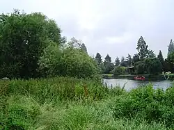 The island is uninhabited and tree-covered. It lies low, acting as a water-meadow in times of flood, opposite houses with large river frontages. Its shape shows the cumulative effect of the locally curved stream, its erosion and deposition make the upstream end almost joined to the bank; the downstream end, broken into islets.