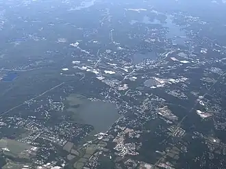 Budd Lake, which the community is named after, is the source of the South Branch Raritan River. A glacial lake at an elevation of 933 feet (284 m), Budd Lake has a surface area of 374 acres (1.51 km2).[16] It is 7 to 12 feet (2.1 to 3.7 m) deep and can have large algal blooms. The adjacent bog, created by thousands of years of decaying plant material, supports wetland plants such as black spruce and tamarack, which grow on the floating mass.[16] The lake is recharged through groundwater seepage through a series of wetlands, and serves as the headwaters of the Raritan River's South Branch.[17] It is closely bordered by U.S. Route 46 to the south and Sand Shore Road to the east.[18]