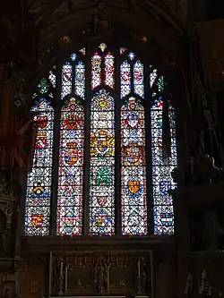 Modern stained-glass window in the Buffs' Chapel (Warriors' Chapel) of Canterbury Cathedral in Kent, showing the coats of arms of Queen Elizabeth I and various subsequent Colonels-in-Chief and Colonels, up to the 20th century