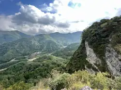 Moving in the direction of the central Kunisaki Peninsula from the city center, many mountain valleys can be seen. These numerous valley radiate from Mount Futago (両子山, Futago-san), an inactive volcano located at the center of the peninsula. Among these valleys is Ebisu Valley (夷谷, Ebisudani). The valley contains the rocky trekking course Nakayama Senkyo (中山仙境) which was designated as a "Place of Scenic Beauty" by the Japanese government in 2018.[2]