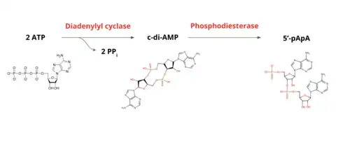 Phosphodiesterase (PDE) enzymes degrade cyclic di-AMP to the linear molecule 5’-pApA (phosphadenylyl adenosine). 5'-pApA is also involved in a feedback inhibition loop that limits GdpP gene-dependent c-di-AMP hydrolysis, leading to elevated c-di-AMP levels.[8]