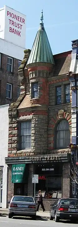 Originally from Canada, McNally designed many buildings with draftsman William C. Knighton in the late 1880s. The keystone in the arch over one of the second story windows bears the facsimile of the beaver dollar, a $10 gold piece minted in 1849 when Oregon was a territory. The builders were Erixson and Luker who used Utah red and Tenino grey sandstone on the facade and two columns of polished Scotch granite support a half-arch doorway.[3][4]