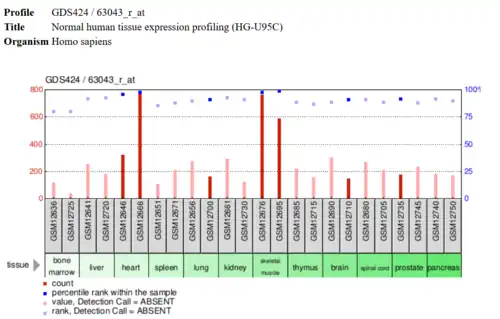 C15orf61 is ubiquitously expressed across human tissues with moderate variability. Expression of c15orf61 is highest in skeletal muscle, fat, and cerebellum brain tissues.[5][7]