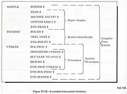 Declarative statements defining the data for a program are grouped into units called data designs. Data designs consist of precise definitions for temporary and permanent data storage areas, input areas, output areas and special data units. The dynamic statements that act on data or perform calculations are grouped into procedures. Data designs and procedures are further grouped to form system elements of a CMS-2 program. The compiler combines system elements into a compile time system. A compile time system may stand alone or be part of a larger program.[1]