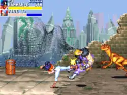 Up to three players can play at once, guiding their selected characters through eight stages, battling various enemies and bosses.[3] There are four playable characters, each with their own strengths and weaknesses: Jack (balanced type), Hannah (skill type), Mustapha (speed type), and Mess (power type). The game's titular dinosaurs make appearances as neutral characters that may attack both player characters and enemies.