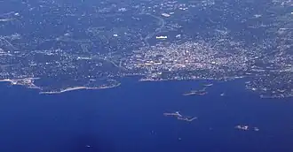 ![]() Calf Island (highest of the three large islands in bottom right) as seen facing Port Chester, New York | |