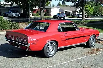 The Mustang GT/CS features included: Marchal or Lucas Fog Lights, twist-type DZUS hood pins, side scoops, pop-open gas cap, rear spoiler decklid with end caps, and taillight panel with 1965 Thunderbird taillights (non sequential). Side stripes with the "GT/CS" die-cut logo, along with a rear decklid stripe were included, and were available in white, black, red, and metallic medium blue only. It was available in all standard Mustang colors for 1968, all Ford engine and transmission combinations (except 427/C-6, which was dropped for all '68s).