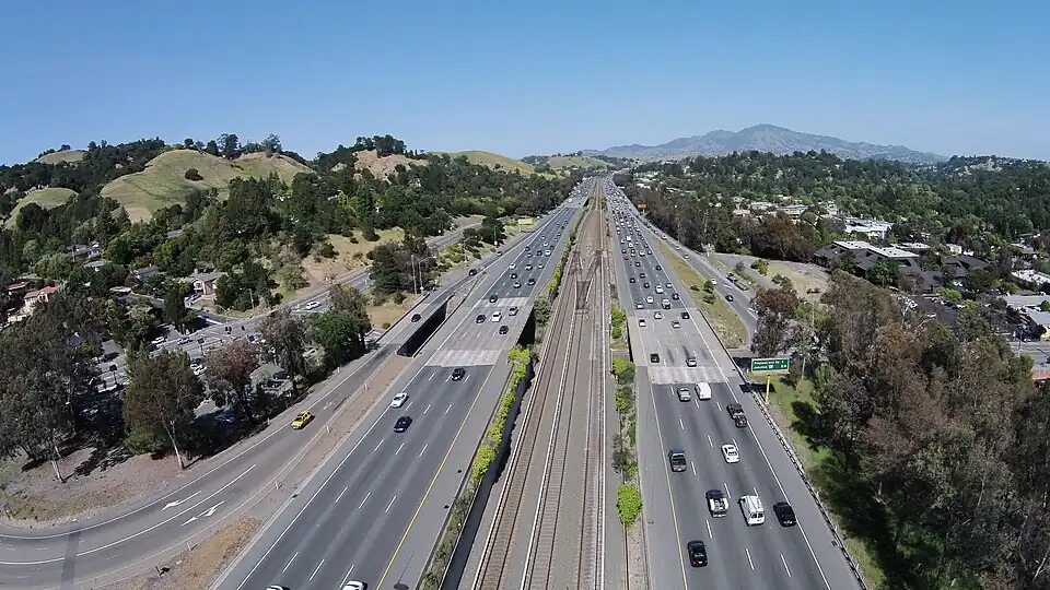 The Yellow Line of the Bay Area Rapid Transit (BART) system runs in the freeway's center median, excepting the vicinity of the Caldecott Tunnel and the approach to the interchange with Interstate 680.