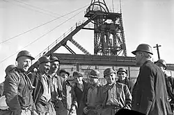 A group of coal miners and 'Bevin Boys' talk to a safety officer outside the colliery at Ollerton, Nottinghamshire, in February 1945.