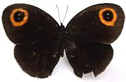 Upperside: Ground colour dark chocolate brown, slightly blackish, paler towards margins. Very large round orange-ringed apical ocellus (11mm), black inner with two white pupils. Edges of ring distinct and regular. Hindwing single tornal ocellus in space 2. Narrow reddish ring, black inner and white pupil.