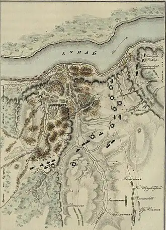 Deciding to attack Brăila, Prozorovsky instructed General Kutuzov to prepare a regulation, and Kutuzov handed over this matter to Lieutenant Colonel of the General Staff K.F. Toll for execution.[3] The attack was supposed to be at night, and it would be a surprise to the enemy. The assault detachment (18 battalions, 7,000 soldiers in total) was divided into three columns. At 11 p.m. on April 20, the troops moved to the ramparts of the fortress. The column led by Prince V.V. Vyazemsky lost its way in the darkness, "almost all fell into the cellars of the burnt houses and, mistaking them for the moat of the fortress, began to shoot and became completely upset, not even reaching the moat. They began to put up ladders, but they turned out to be too short."[3] Russian soldiers were subjected to devastating shooting by the besieged Turks. In the 13th Jaeger Regiment, out of 1,100 people, about 900 soldiers and officers were killed and wounded.