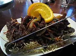 Deep fried strips of beef coated in a dark sweet sauce featuring ginger, garlic, and hot peppers, commonly served with a small amount of julienned carrots and onions.[17] Ginger beef is derived from the original geung ngao yuk (Chinese: 薑牛肉) dish. Though common across the country, it is ubiquitous in Calgary and the Prairies.[18] The invention of ginger beef is generally traced back to the Silver Inn in Calgary in the mid-1970s.[5][8][9][19]