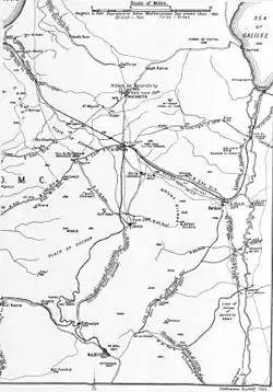 The Esdrealon Plain, also known as the Jezreel Valley, and the Plain of Armageddon, stretches to the white houses of Nazareth in the foothills of the Galilean Hills on its northern edge 10 miles (16 km) away, to Jenin on its southern edge at the foot of the Judean Hills, through Afulah to Beisan on its eastern edge, close to the Jordan River.[17] On its western edge near Lejjun, at the mouth of the Musmus Pass, the ancient fortress of Megiddo on Tell al Mutesellim, dominates the Esdrealon Plain, across which Romans, Mongols, Arabs, Crusaders and the army of Napoleon had marched and fought.[20] The road and railway network, on which the German and Ottoman forces in Palestine depended for supplies and communications, crossed this plain via the two important communication hubs of Afulah and Beisan. (See Falls Map 21 Cavalry advances detail)[21][22] The railway passed from the plain into the Judean Hills south of Jenin, to wind through a narrow pass in the foothills before climbing to Messudieh Junction, where it again branched. One line ran westward to Tulkarm and Eighth Army headquarters, before turning south to the railhead to supply the Eight Army front line troops on the coastal plain, while the main railway line continued south-eastward to Nablus, and the Seventh Army headquarters.[23]