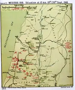 In preparation for the Battle of Megiddo, the Desert Mounted Corps, consisting of the 4th and 5th Cavalry Divisions, the Australian Mounted Division's 3rd and 4th Light Horse Brigades, concentrated near Ramleh, Ludd (Lydda), and Jaffa. Here dumps were formed of all surplus equipment, before the brigades and divisions moved up close behind the XXI Corps infantry divisions, near the Mediterranean coast.[3][4][5]